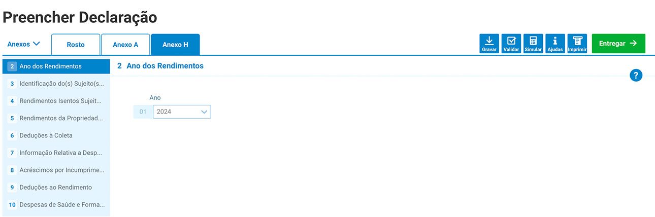 Indique o ano a que respeitam os rendimentos. Por exemplo, em 2025, deve declarar os rendimentos que recebeu em 2024.