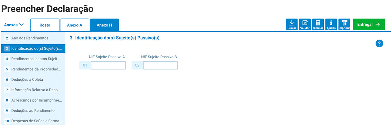 Identifique-se inserindo o seu NIF no campo “NIF Sujeito Passivo A”. Em caso de entrega conjunta da declaração, inscreva o NIF do seu cônjuge ou unido de facto no campo “NIF Sujeito Passivo B”. Deve respeitar sempre a posição assumida nos quadros 3 (sujeito passivo A) e 5A (sujeito passivo B) do rosto da declaração.