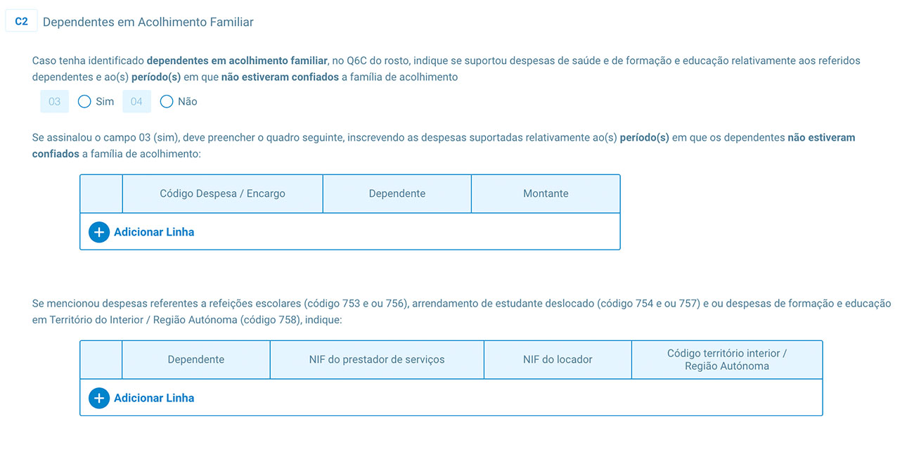 - Se selecionou o campo 03 (“Sim”), as despesas de saúde e educação, relativas ao período em que o dependente não esteve confiado a família de acolhimento, devem ser indicadas por dependente e natureza da despesa;