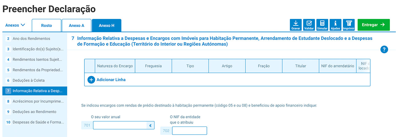 - Se indicou encargos com rendas de prédio destinado à habitação permanente (código 05 ou 08) e beneficiou de apoio financeiro indique no campo “701” o valor recebido e no campo “702” o NIF da entidade que o pagou.