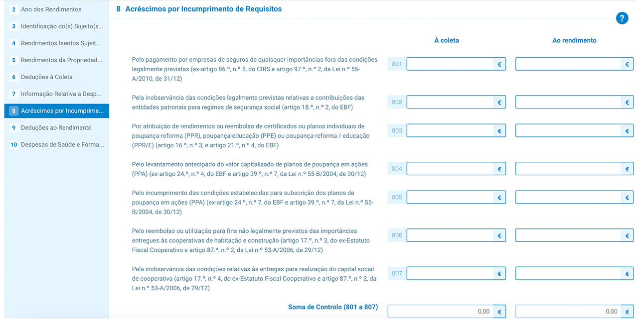 Os valores indevidamente deduzidos têm de ser devolvidos acrescidos de uma majoração de 10% por cada ano ou fração decorrido desde aquele em que foi exercido o direito à dedução. Exemplificando, se, em 2023, investiu num PPR e deduziu 200 euros, deve declarar neste quadro, no campo “803”, 240 euros (200 euros + 20 euros + 20 euros).