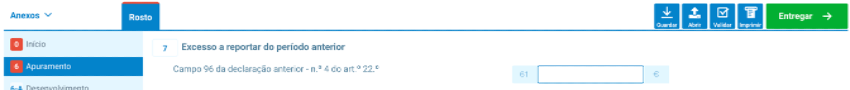Inscreva no campo 61 o valor do imposto a reportar, constante do campo 96 da última declaração periódica apresentada, ainda que esta seja entregue fora de prazo ou o valor tenha sido alterado por uma declaração de substituição do período anterior.
