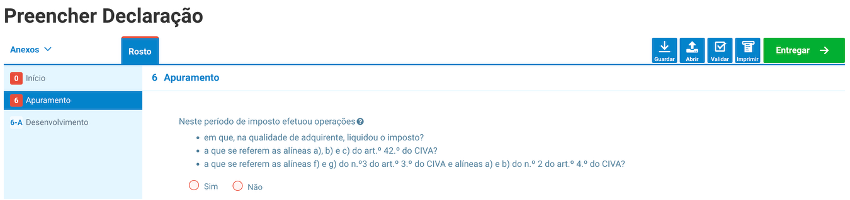 Segue-se o apuramento do imposto a pagar. Para tal, comece por responder se, no período de imposto, efetuou operações: