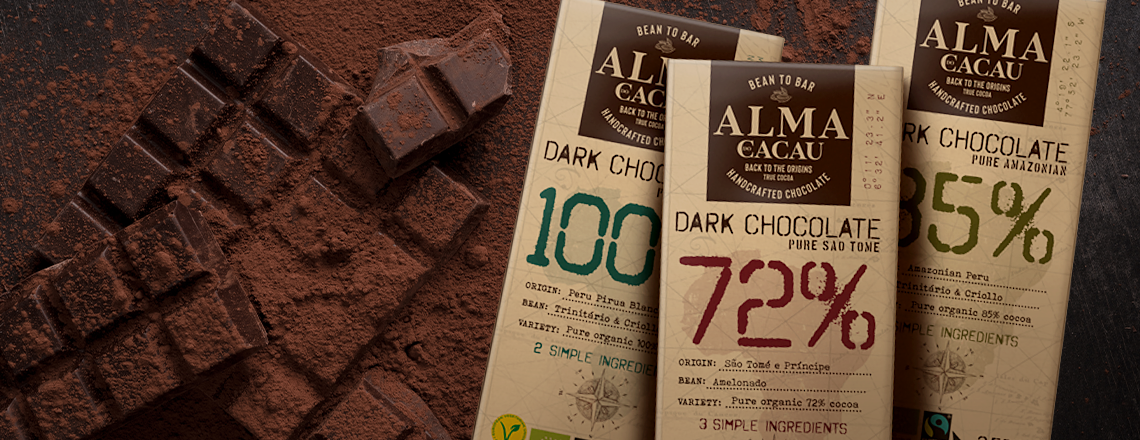A Alma do Cacau é uma marca de chocolates artesanais, produzidos apenas com 3 ingredientes: grãos de cacau, açúcar de côco e manteiga de cacau. A embalagem, 100% reciclável e livre de plástico, assegura a redução da pegada ecológica no meio ambiente.