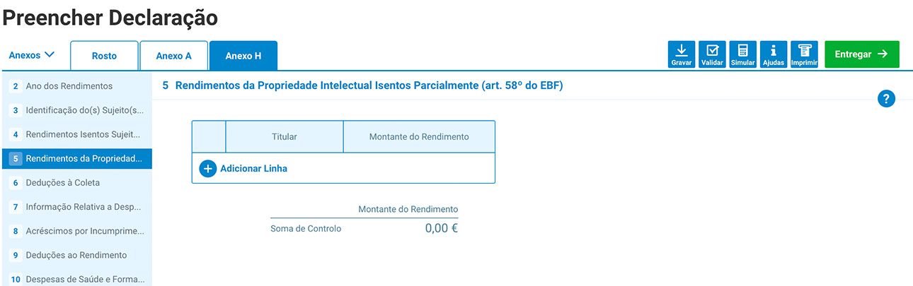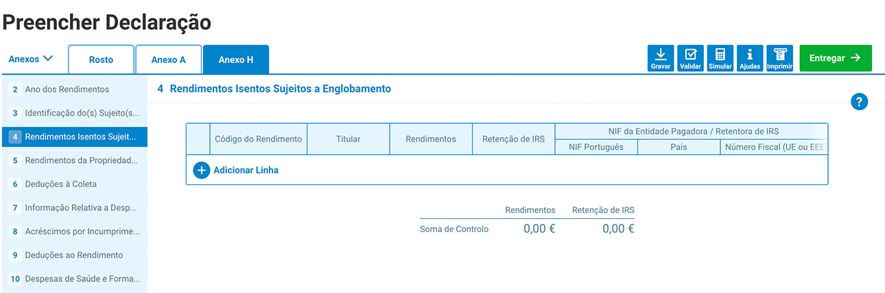 Proceda da seguinte forma, para declarar cada rendimento isento de IRS sujeito a englobamento:
