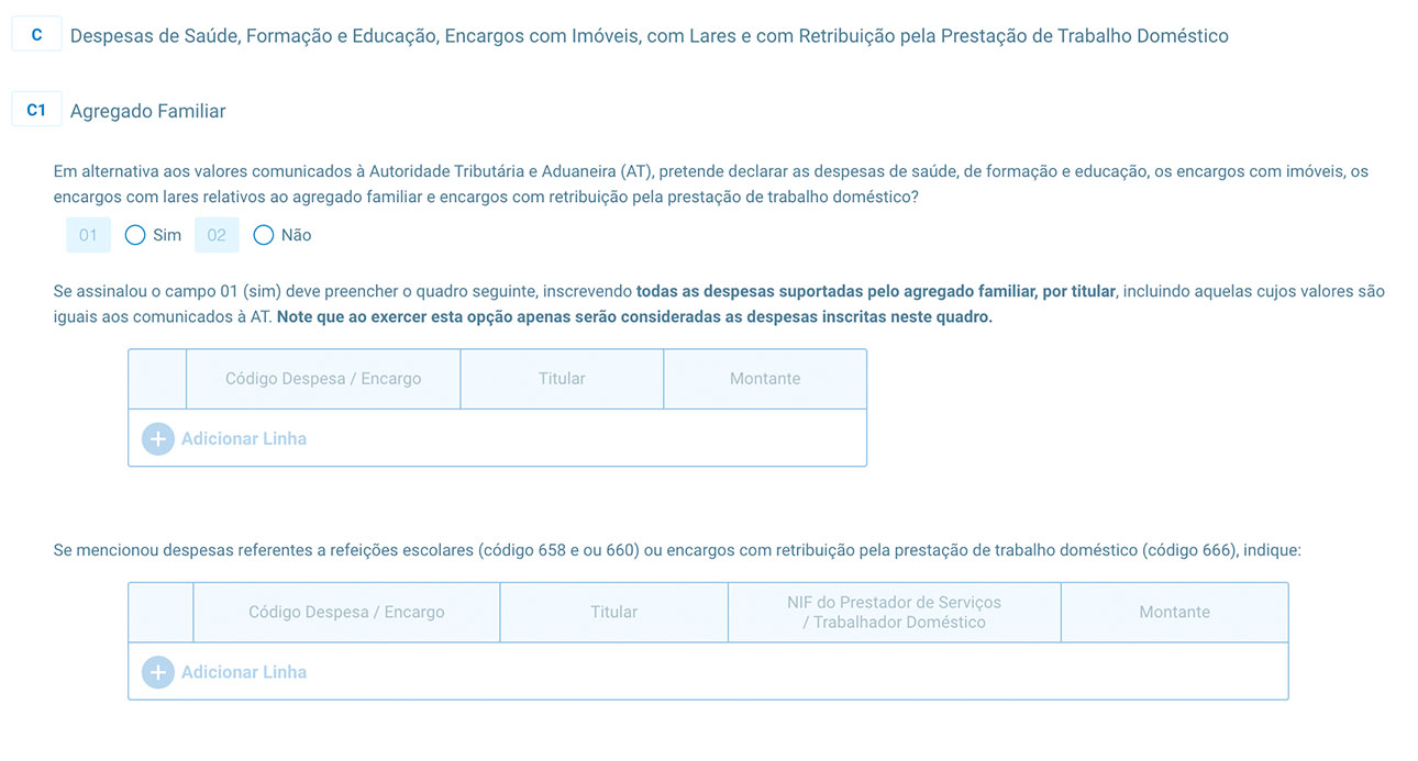 - Se assinalou o campo 01 (“Sim”), clique em “Adicionar Linha” para introduzir cada despesa;