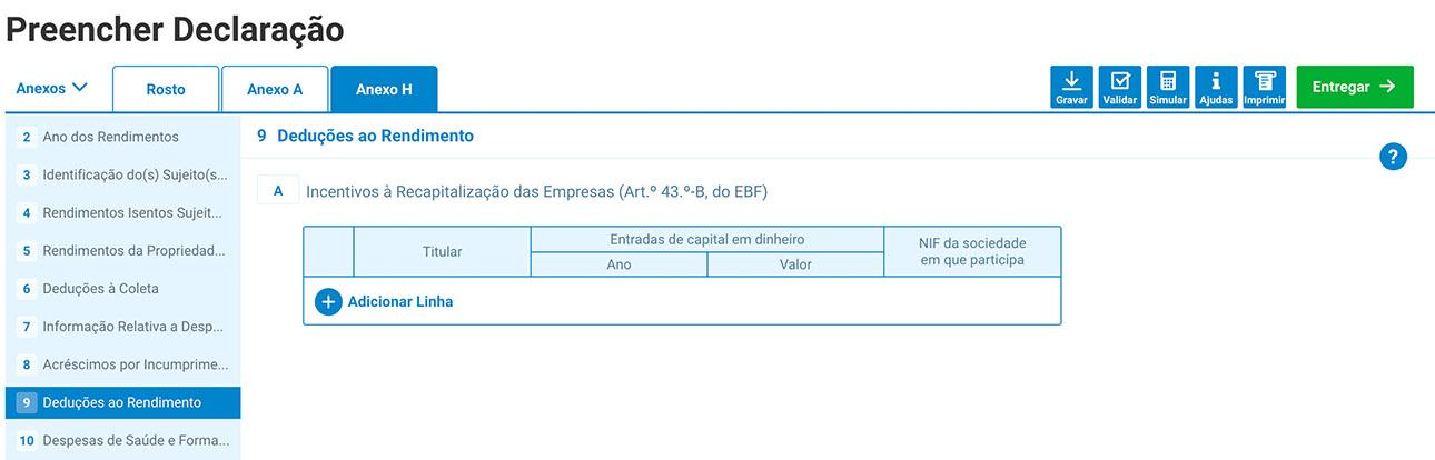Preencha este quadro do anexo H, se deixou de reunir condições para usufruir de um dos benefícios do quadro. Por exemplo, se beneficiou de deduções à coleta por investimento num Plano Poupança Reforma (PPR) e efetuou o resgate fora das condições legais.