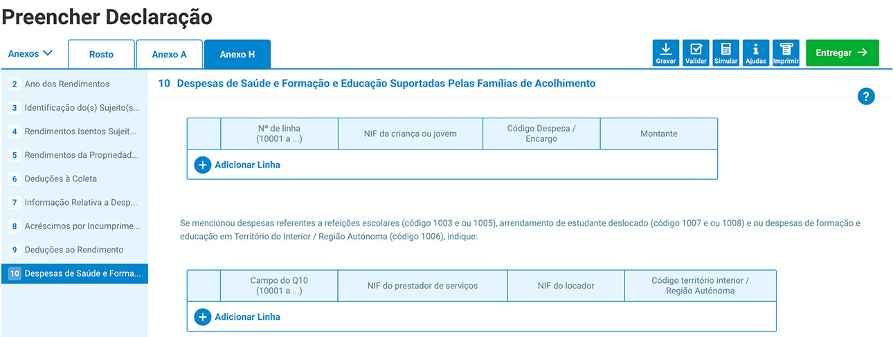 Preenche este quadro do anexo H quem acolheu, em 2024, crianças ou jovens em regime de família de acolhimento e, nesse período, suportou despesas de saúde e formação e educação desses dependentes.