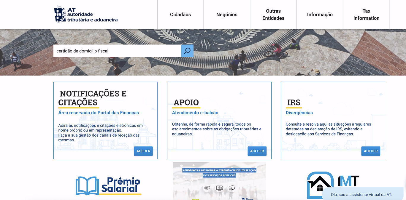 Aceda ao Portal das Finanças e, no campo de pesquisa, escreva “certidão de domicílio fiscal”.