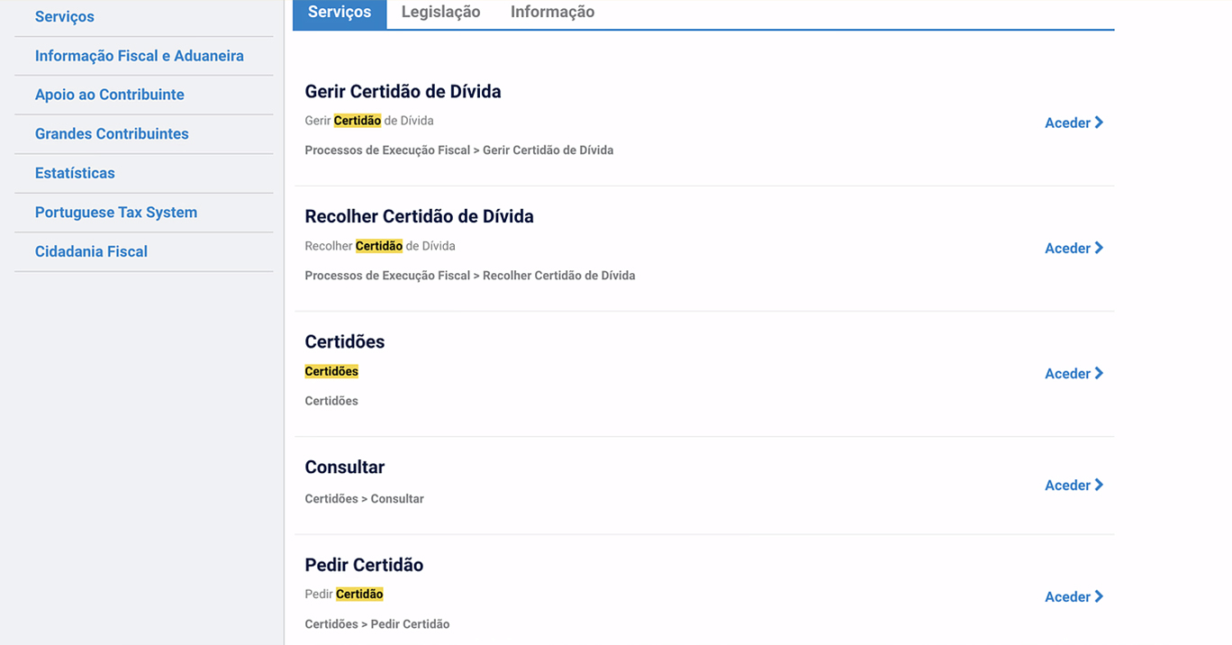 Na lista de resultados da pesquisa, escolha a opção “Pedir Certidão” e clique em “Aceder”. Depois, autentique-se inserindo o seu Número de Identificação Fiscal (NIF) e a senha de acesso ao Portal das Finanças. Também poderá autenticar-se através da Chave Móvel Digital ou do cartão de cidadão.