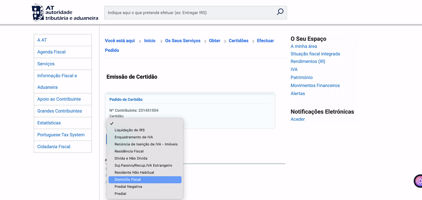 A emissão da certidão de domicílio fiscal obtém-se no Portal das Finanças, ficando disponível imediatamente. Para tal, deve seguir estes passos: