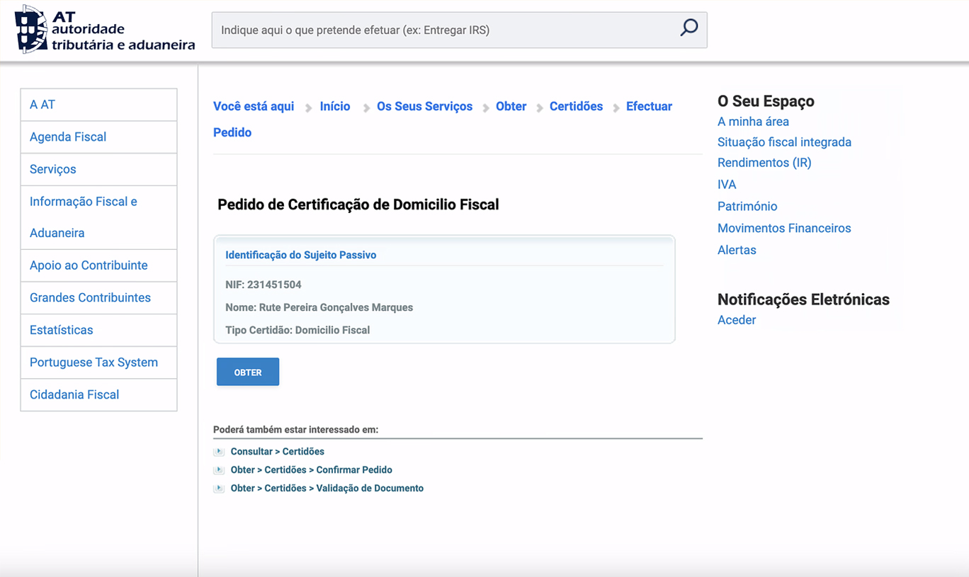 Confirme os dados relativos ao “Pedido de Certificação de Domicílio” Fiscal e carregar em “Obter”.