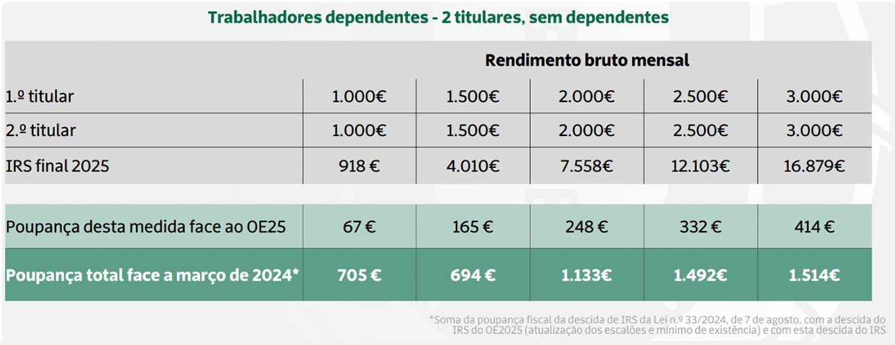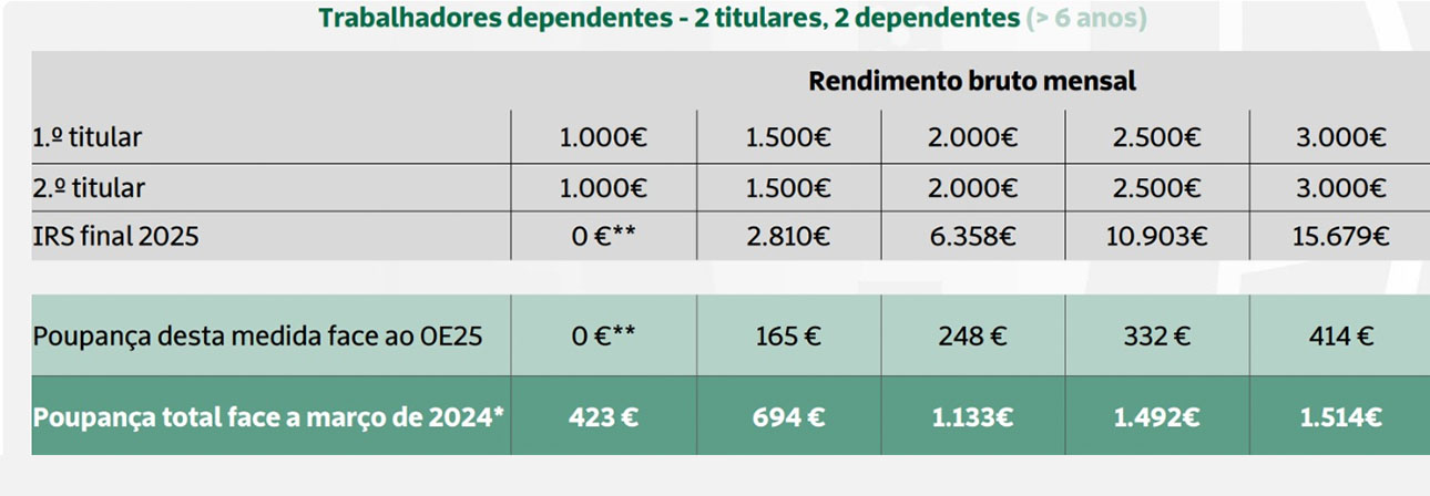Tratando-se de dois trabalhadores dependentes com dois filhos em que cada um aufira 1 500 euros brutos por mês, a poupança anual chegará a 165 euros. A redução no IRS eleva-se para 414 euros em 2025 se os dois trabalhadores receberem, cada um, 3 000 euros mensais.
