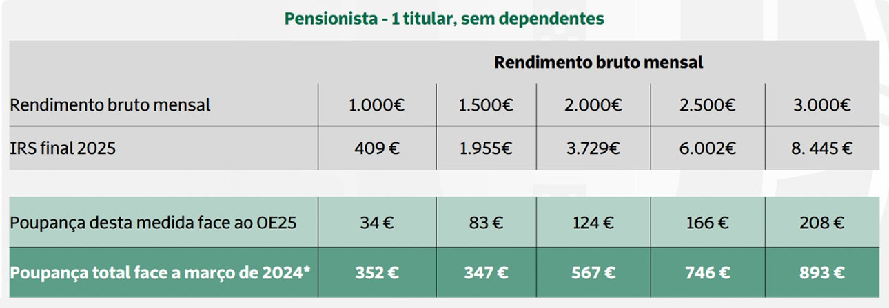 Já um pensionista com um rendimento bruto mensal de 1 000 euros, terá uma poupança anual de 34 euros. Mas se receber um rendimento bruto de 3 000 euros por mês poupará 208 euros com a redução das taxas do IRS.