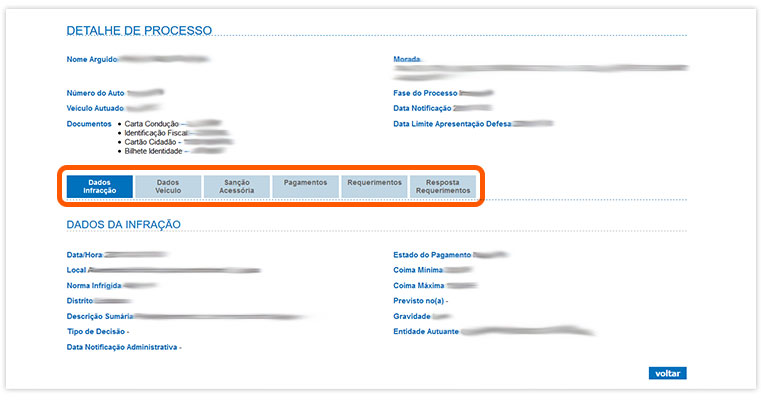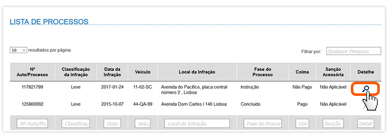 7. Clique em “Consultar” para verificar a sua lista de processos de contraordenações rodoviárias. Pode aceder a informação adicional sobre cada processo, clicando em “Detalhe”.