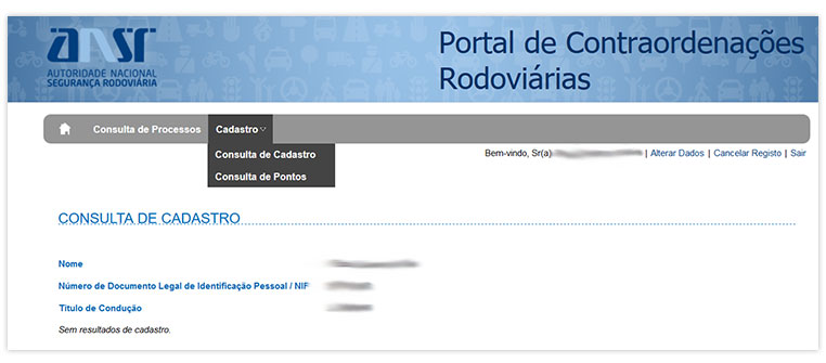 5. No portal das contraordenações rodoviárias pode consultar o seu cadastro, clicando em “Cadastro” e depois em “Consultar cadastro”. É aqui que aparece todo o histórico de contraordenações rodoviárias. Note-se, contudo, que os processos de contraordenação por infração leve de estacionamento proibido, indevido ou abusivo passaram a ser da responsabilidade do município da área onde se verificam. Assim, todas as informações relativas a estas contraordenações não estão disponíveis neste portal. Qualquer questão relacionada com estes processos deve ser colocada ao respetivo município.