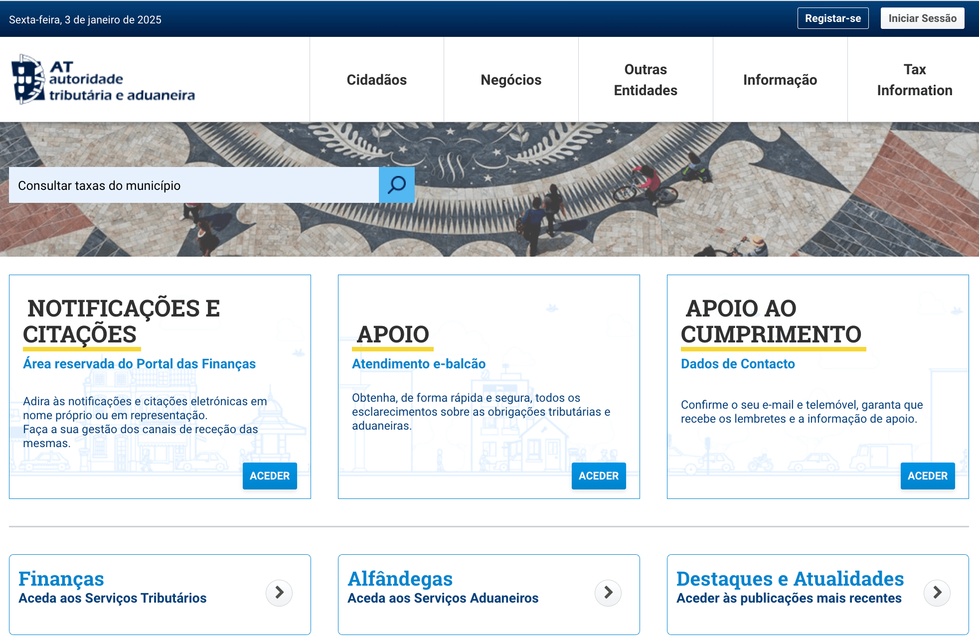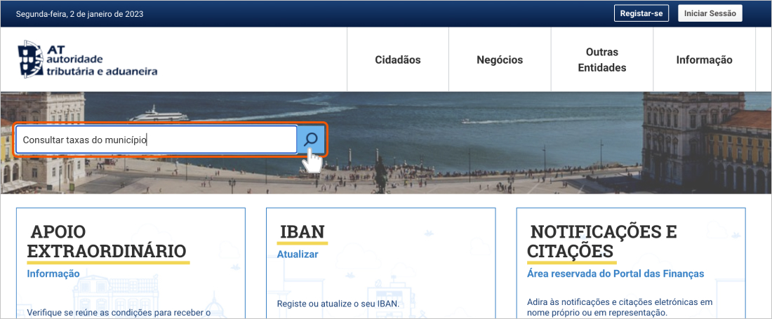 Aceda ao Portal das Finanças. Depois, escreva “Consultar taxas do município” no campo de pesquisa e clique na lupa.