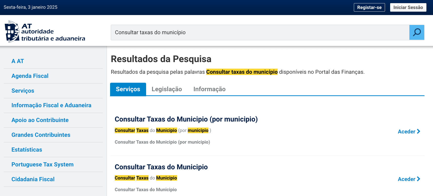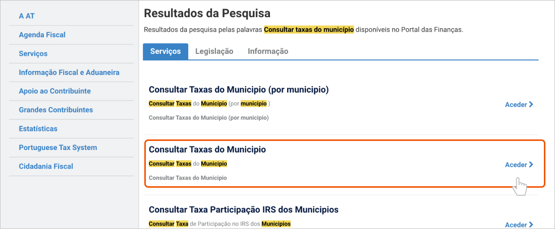 Na lista de resultados da pesquisa, procure a opção “Consultar taxas do município” e clique em “Aceder”.