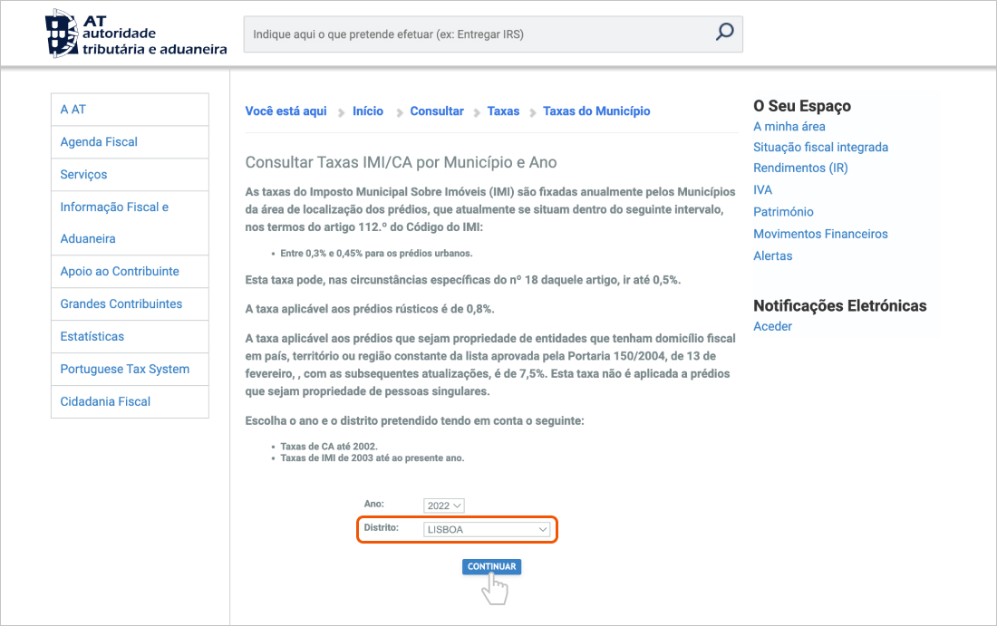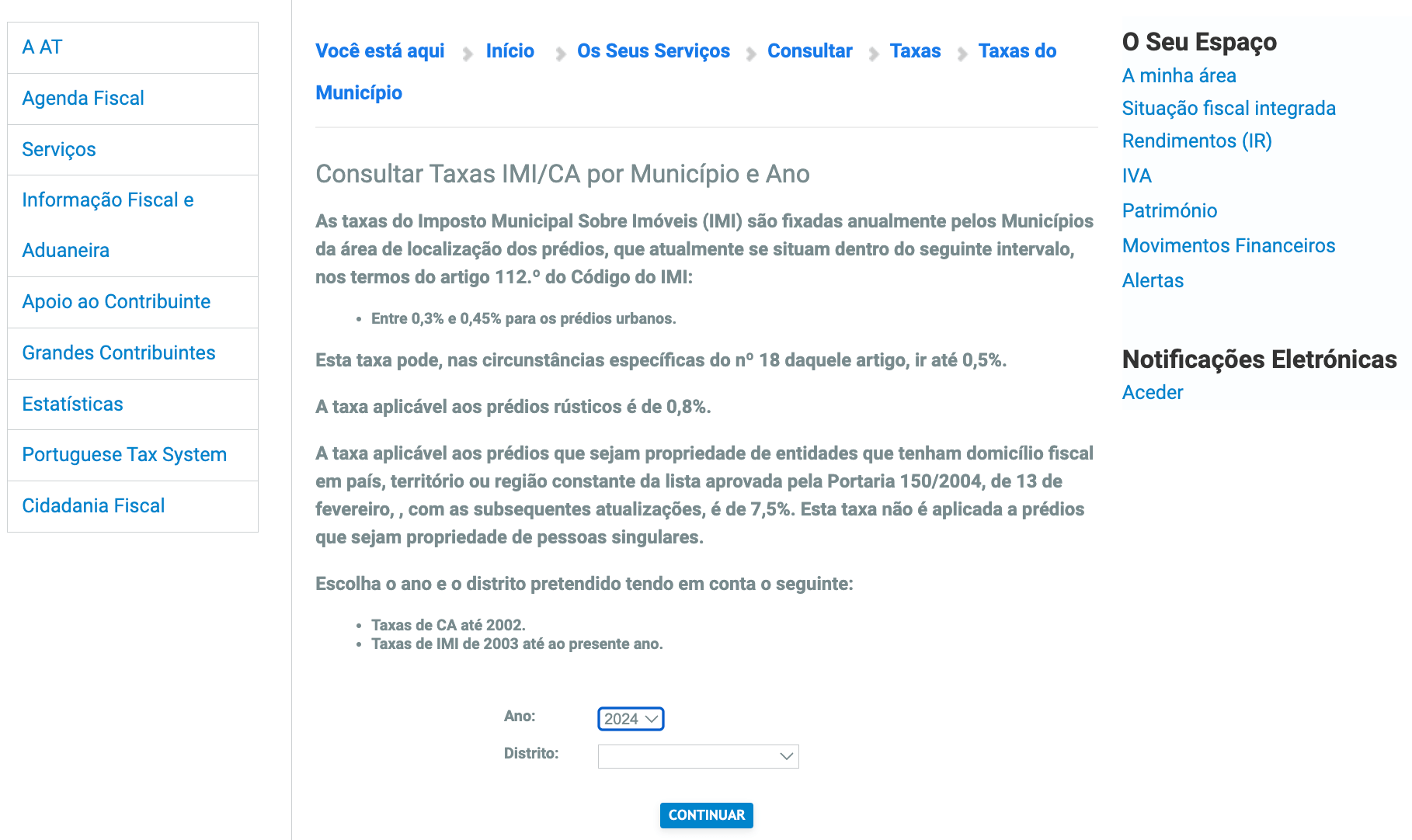 Escolha o ano respeitante ao imposto (neste caso, 2024) e o distrito onde se situa o imóvel. Em seguida, clique em “Continuar”.