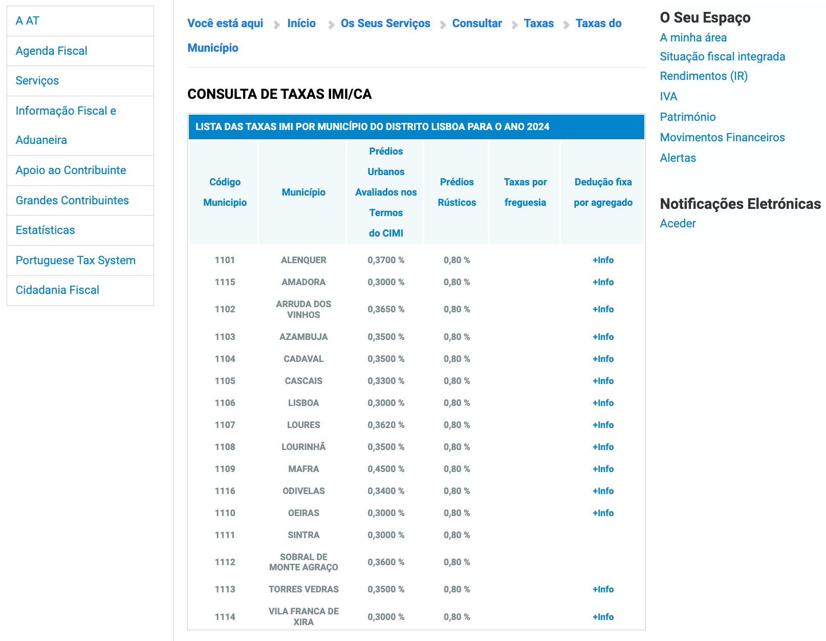 Identifique o seu município e verifique qual a taxa de IMI correspondente. Para consultar o desconto fixo por agregado familiar clique no respetivo link “+Info”, na coluna “Dedução fixa por agregado”.