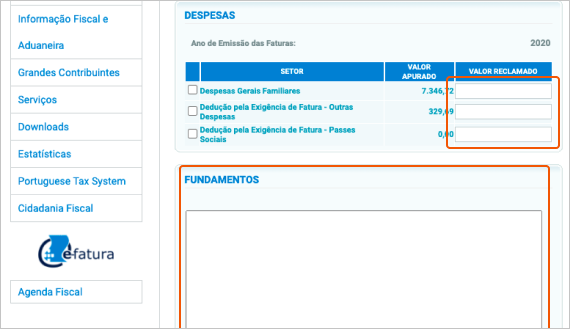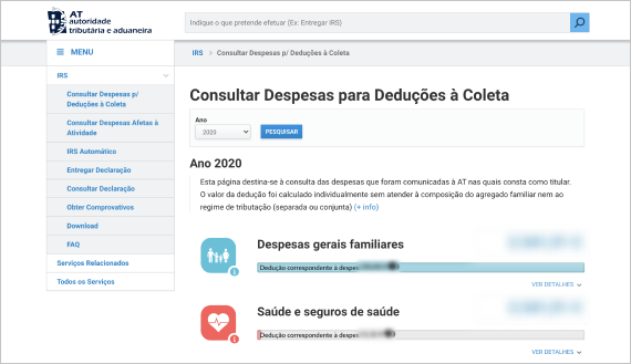 Ao longo do ano, as despesas comprovadas por faturas vão aparecendo na página pessoal do sistema e-fatura, no Portal das Finanças, distribuídas pelas várias deduções à coleta do IRS, sendo possível verificar o valor acumulado em cada uma.