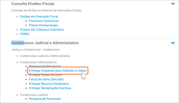 Na página “Mapa do Sítio”, faça scroll down até encontrar a opção “Contencioso Judicial e Administrativo” e clique na opção “Entregar Despesas para Dedução à Coleta”.