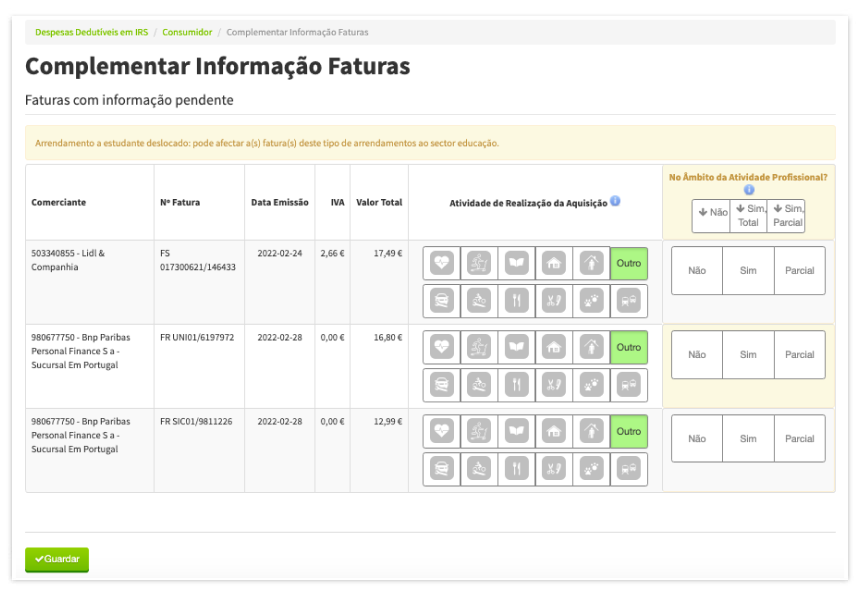As despesas devem constar de faturas com Número de Identificação Fiscal (NIF) ou de outros documentos comunicados à Autoridade Tributária e Aduaneira (AT). No caso de despesas de bens e prestação de serviços, é necessário, ainda, imputá-las, total ou parcialmente, à atividade (ver imagem abaixo).