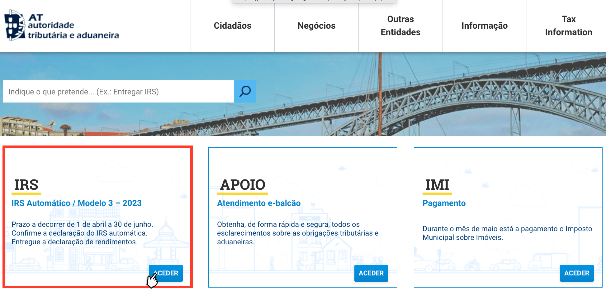 1. Na página inicial do Portal das Finanças, clicar no atalho “IRS – IRS Automático / Modelo 3 – 2023”;