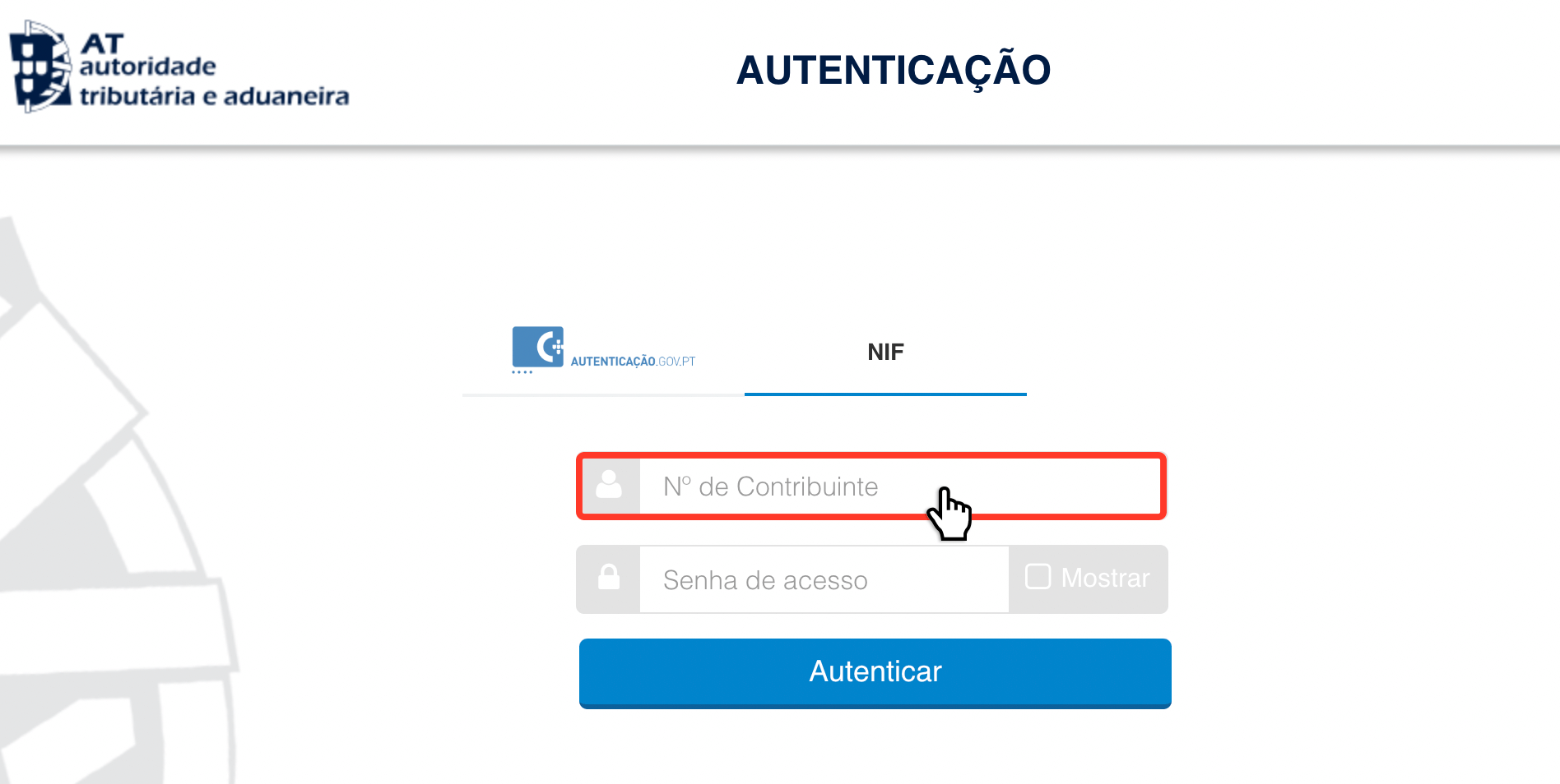 2. Efetuar a autenticação no Portal das Finanças, através do NIF e da senha de acesso ou utilizando o cartão de cidadão ou a Chave Móvel Digital;