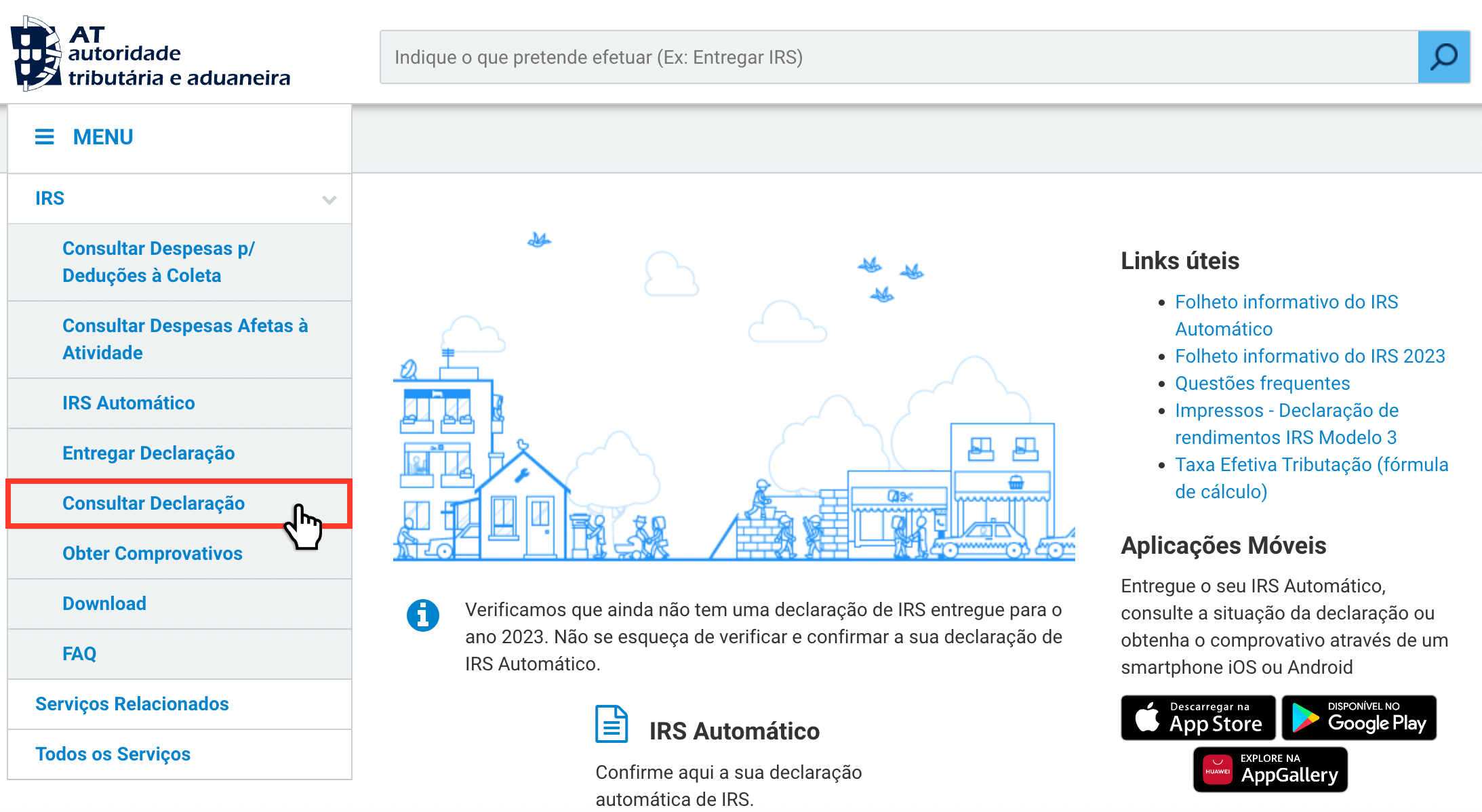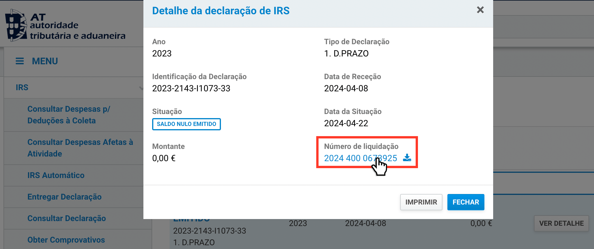 A AT envia a nota de liquidação ao contribuinte por correio. Em alternativa, este documento pode ser consultado no Portal das Finanças seguindo estes passos: