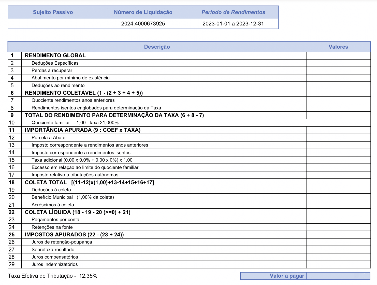Valor que se obtém depois de adicionar o “Rendimento coletável” e os “Rendimentos isentos englobados para determinação da taxa” e subtrair a esta soma o “Quociente rendimentos anos anteriores”. Na grande maioria dos casos, esta parcela da nota de liquidação corresponde ao “Rendimento coletável”.