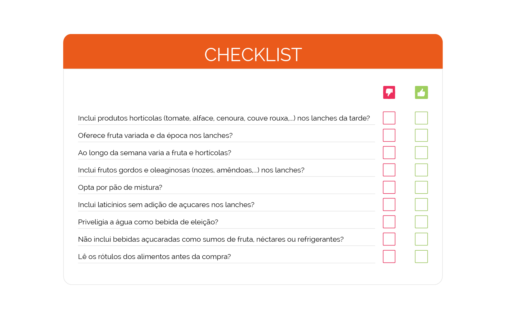 No guia da DGS e DGE é disponibilizada uma checklist para ajudar os pais a verificarem se os lanches que preparam para os seus filhos levarem para a escola são ou não saudáveis. Descarregue a checklist em PDF.
