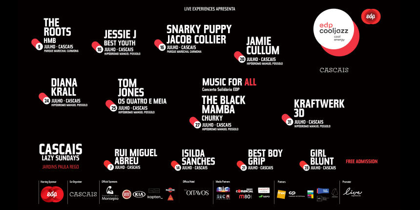 De 9 a 31 de julho o Parque Marechal Carmona e o Hipódromo Manuel Possolo, em Cascais, receberão artistas como Diana Krall, Tom Jones, Jamie Cullum, Snarky Puppy, Jacob Collier, The Roots, Jessie J e Kraftwerk.
