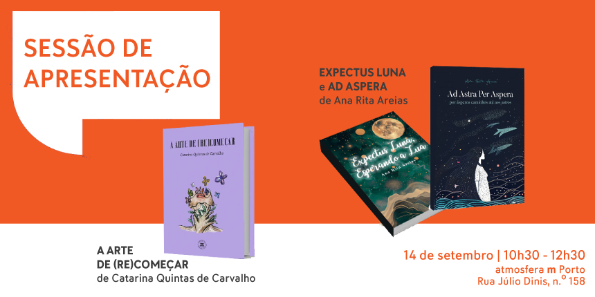 “Expectus Luna”, “Ad Astra Per Aspera” e “Arte de (Re) Começar”, da autoria de Ana Rita Areias e Catarina Quintas de Carvalho, respetivamente, são as obras que, entre as 10h30 e as 12h30 de dia 14 de setembro, serão apresentadas pelas duas autoras portuguesas.