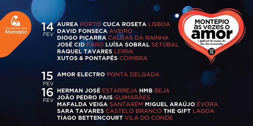 Beja, Castelo Branco, Estarreja, Évora, Guimarães, Lagoa e Santarém são as “Capitais do Amor” que acolhem os HMB, Sara Tavares, Herman José, Miguel Araújo, João Pedro Pais, The Gift e Mafalda Veiga, respetivamente, encerrando esta edição do festival Montepio às Vezes o Amor.
