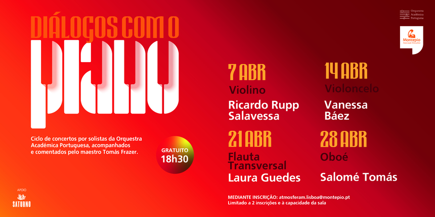 Cada concerto contará com a presença de um solista da Orquestra Académica Portuguesa (OAP). O ciclo inicia-se com o violinista Ricardo Rupp Salavessa, a 7 de abril, seguindo-se a flautista Laura Guedes (14 de abril), a violoncelista Vanessa Báez (21 de abril) e a oboísta Salomé Tomás (28 de abril). Fundada em 2014 por David Bracke e sediada em Lisboa, a OAP representa Portugal na Federação Internacional de Orquestras Amadoras e tem como missão proporcionar a jovens estudantes a continuidade da formação artística em contexto académico.