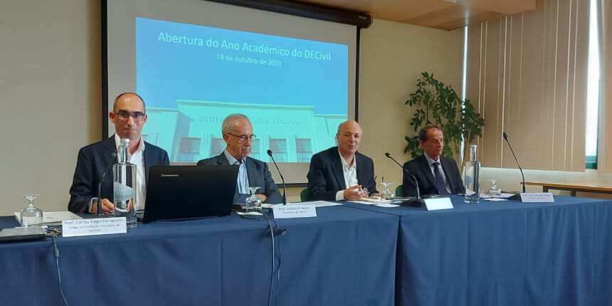 Na abertura da sessão, o Professor Pedro Brogueira, presidente do Conselho Científico do Instituto Superior Técnico, deu as boas-vindas e fez uma breve análise da situação atual face à moderada participação de novos alunos no curso de Engenharia Civil, terminando com um agradecimento especial aos “patrocinadores, nomeadamente à Fundação Montepio, que estão com o Instituto Superior Técnico e ajudam esta Universidade a alcançar o sucesso”.