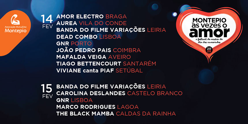 Já é conhecido o cartaz da 6ª edição do Festival “Montepio Às Vezes O Amor”, que se realiza a 14 e 15 de fevereiro de 2020, em 12 cidades portuguesas. Usufrua das vantagens de ser Associado e não fique de fora de um dos acontecimentos musicais de 2020.