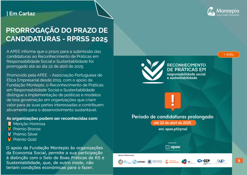 A APEE – Associação Portuguesa de Ética Empresarial, promotora do Prémio RPRSS, com o apoio da Fundação Montepio desde a sua 1.ª edição, prorrogou o prazo de apresentação de candidaturas para a 11.ª edição até 22 de abril de 2025. As organizações, empresas e entidades não empresariais, ainda estão a tempo de concorrer ao Prémio de Reconhecimento de Práticas em Responsabilidade Social e Sustentabilidade 2025.