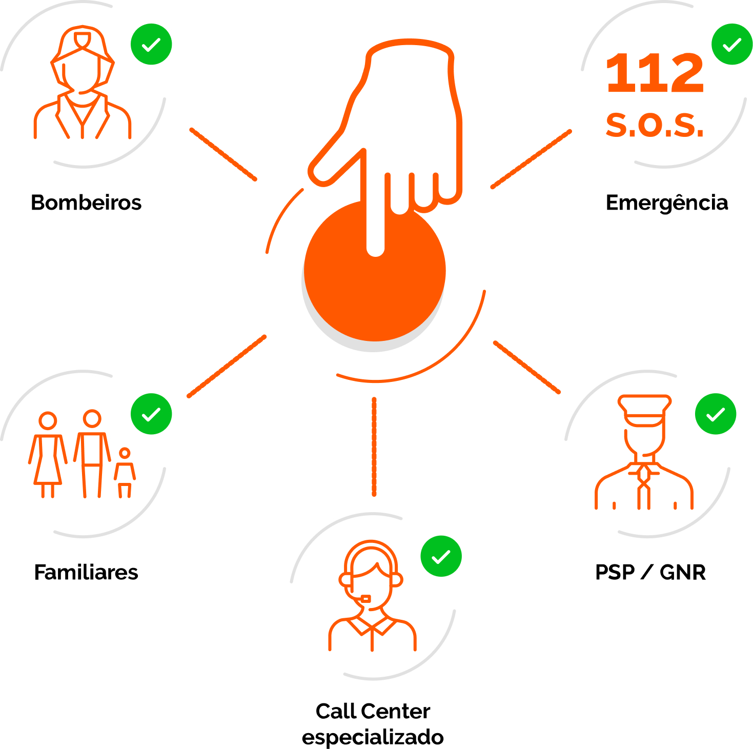 Em situações de urgência, doença ou perigo, o utilizador aciona o botão SOS e estabelece contacto com um Call Center especializado. Em situações de queda o contacto é estabelecido automaticamente. O operador fica em contacto permanente com o utente e responde da forma mais adequada, ao enviar uma ambulância ou contactar familiares.