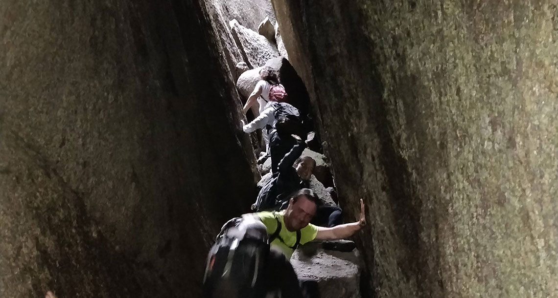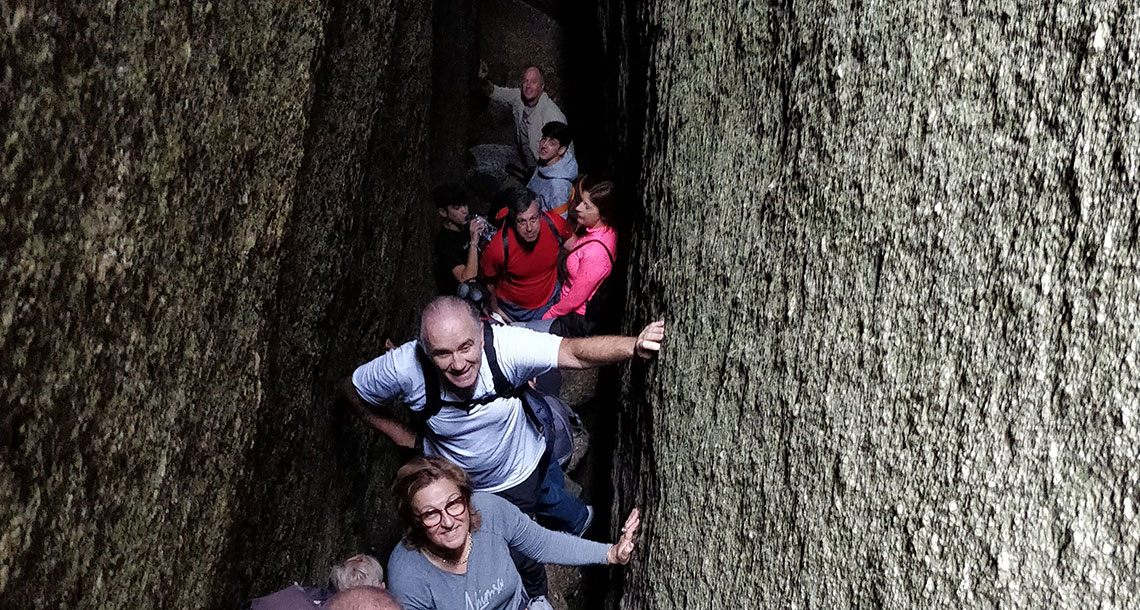 Chegados ao Penedo da Calcedónia, o grupo deparou-se com o grande desafio da caminhada: a passagem pela estreita fenda, rodeada por imensos blocos graníticos. A ajuda do guia foi imprescindível nesta etapa, indicando aos associados qual a melhor forma de ultrapassar os diferentes obstáculos.