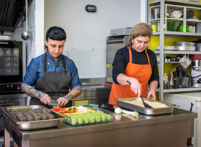 O Mercado de Benfica é um dos mais vivos de Lisboa. Catarina estava certa. Com um investimento de 6 mil euros (um misto de capital próprio e recurso ao crédito bancário), no início de 2021 a InKitchen Veggie arrancou entre as tradicionais bancas de frutas e legumes, tanto como negócio como na sua missão de contribuir para uma alimentação saudável e sustentável. Tudo foi estudado ao pormenor, do food cost de cada refeição à etiquetagem e embalagens. “A nossa cozinha é uma espécie de laboratório… Temos tudo pesado, registado, fichas técnicas pormenorizadas, conhecemos todas as margens. As nossas compras não são feitas a olho. Planificamos o número de refeições e agimos em função disso. Essa é a base da nossa gestão.”