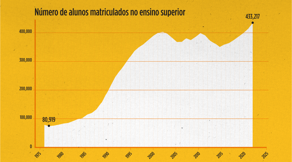 Nunca o país teve tantos cidadãos a estudar em cursos superiores. A linha que mostra a evolução de matriculados neste patamar da educação, desde 1978, denuncia três picos claros: em 2003, havia 400 831 cidadãos matriculados; um novo pico formou-se em 2011, com 396 268 pessoas inscritas; a curva voltou a descer, até 2015, para atingir em 2022 o seu máximo: 433 217 matriculados. Para 2030, a União Europeia espera que 50% das pessoas até aos 34 anos tenham um diploma do ensino superior.