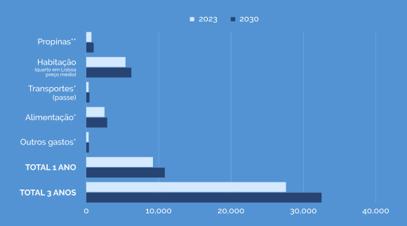 Assim, imaginemos o cenário de um estudante que se desloca para a capital com o objetivo de iniciar uma licenciatura na Universidade de Lisboa. O custo mensal (sem contabilizar bolsas de estudos ou outros atenuantes) pode rondar os 830 euros, incluindo propinas (prestação da propina máxima), quarto (valor médio em Lisboa), alimentação, passe (já com desconto sub23), despesas com livros e materiais. A partir dessa base, e ao longo de três anos de licenciatura, o valor total estará acima de 27 mil euros, já atenuando algumas despesas nos meses de verão.